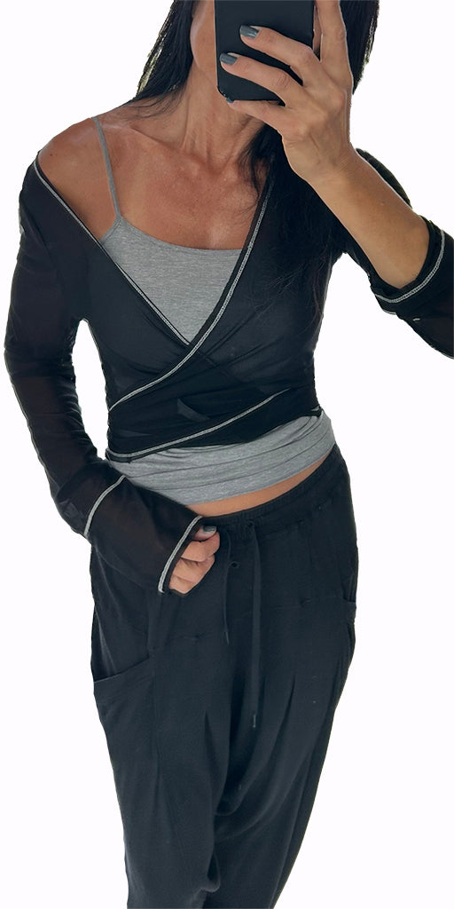 Lightweight sheer mesh wrap top easily layers over cami or tank. Ultra comfortable under jackets for edgy street casual look.